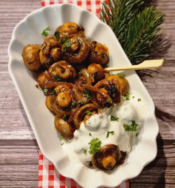 Die Champignons putzen, die Zwiebeln in Ringe schneiden und den Knoblauch fein hacken. Griech. Olivenöl und Omas Butteröl in einer Pfanne erhitzen und die Champignons 5 Minuten anbraten. Dann die Zwiebeln, Knoblauch und die Gewürze dazugeben und weitere 5 Minuten braten. Zum Schluss die Petersilie dazugeben. Für die Knoblauchsoße alle Zutaten miteinander vermengen und 30 Minuten ziehen lassen. Die Champignons mit Meersalz und Regenbogen Pfeffer abschmecken, mit Petersilie bestreuen und mit der Knoblauchsosse und einem frischen Baguette servieren.